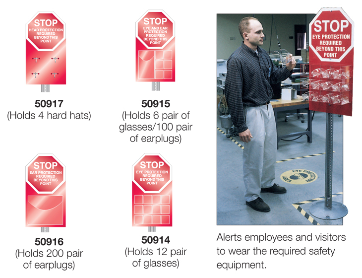 • 4 different designs - Eye Protection (Holds 12 pairs glasses), Eye & Ear Protection (Holds 6 Pairs Glasses/100 Pairs Earplugs), Ear Protection (Holds 200 pairs earplugs), Head Protection (Holds 4 Hard Hats)